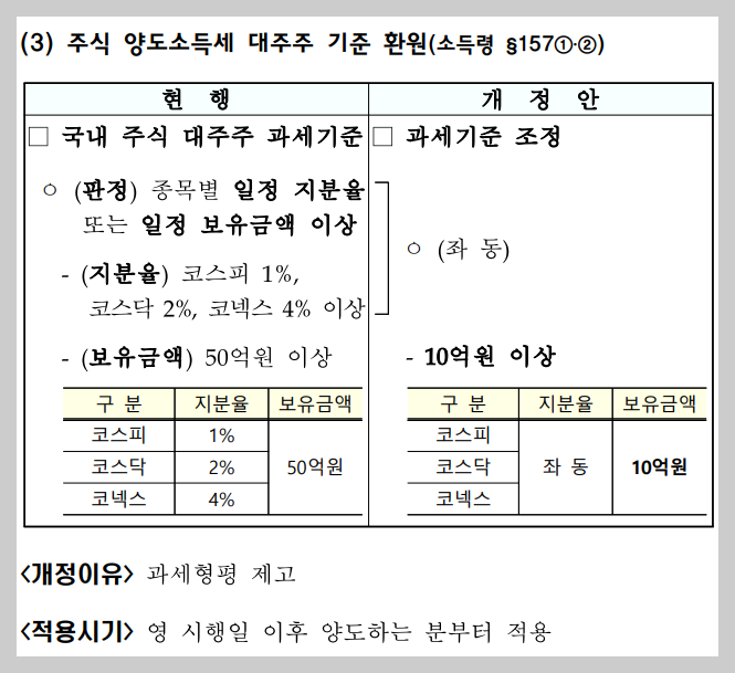 3. 양도소득세 대주주 기준 하향 (50억 → 10억)