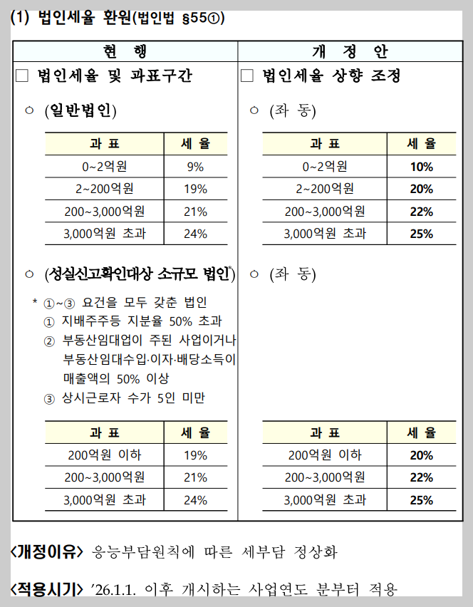 23년도부터 법인세율을 1%씩 인하해 기업들의 세부담이 낮아졌습니다. 이 세율을 다시 원상복귀 시키면 법인 입장에서는 세부담이 다시 증가하겠습니다.
